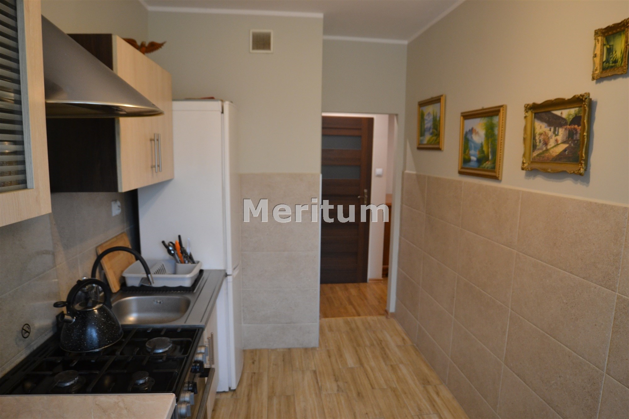 Kuchnia - zabudowa kuchenna, podłoga kafle, ściany płytki do połowy wysokości
